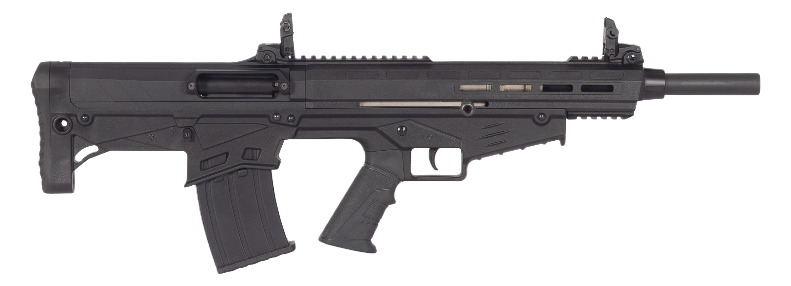 The Sipax BS 12 is a compact semi-automatic 12-gauge shotgun with an 18.5-inch barrel and bullpup design. It features a Picatinny rail, flip-up sights, and a 5-round detachable magazine. Ideal for tactical use and home defense.