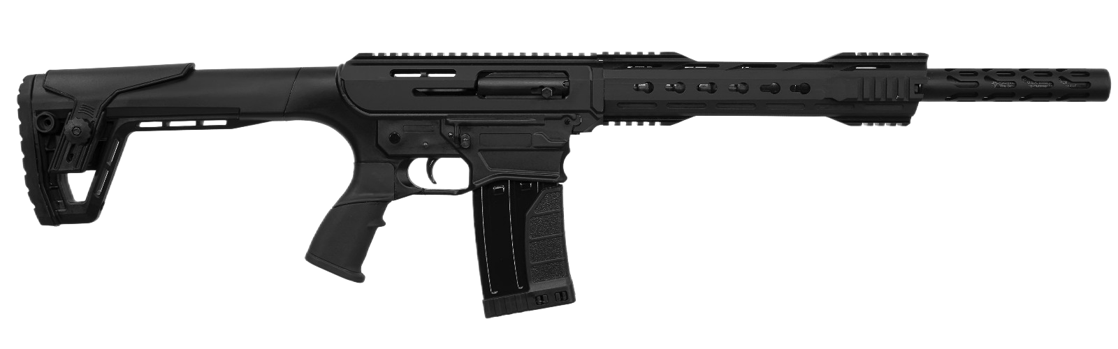 The Sipax AR-12 Polly is a semi-automatic 12-gauge shotgun with an 18.5-inch barrel and familiar AR-style controls. It comes equipped with flip-up sights, a full-length Picatinny rail, and a detachable 5-round magazine. Built for versatility, the Polly is ideal for tactical shooting, home defense, and range use.
